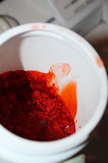 - While the salt is dissolving and the stuff getting wet, I measure the dye into a dry clean plastic container that will be used for nothing else.
